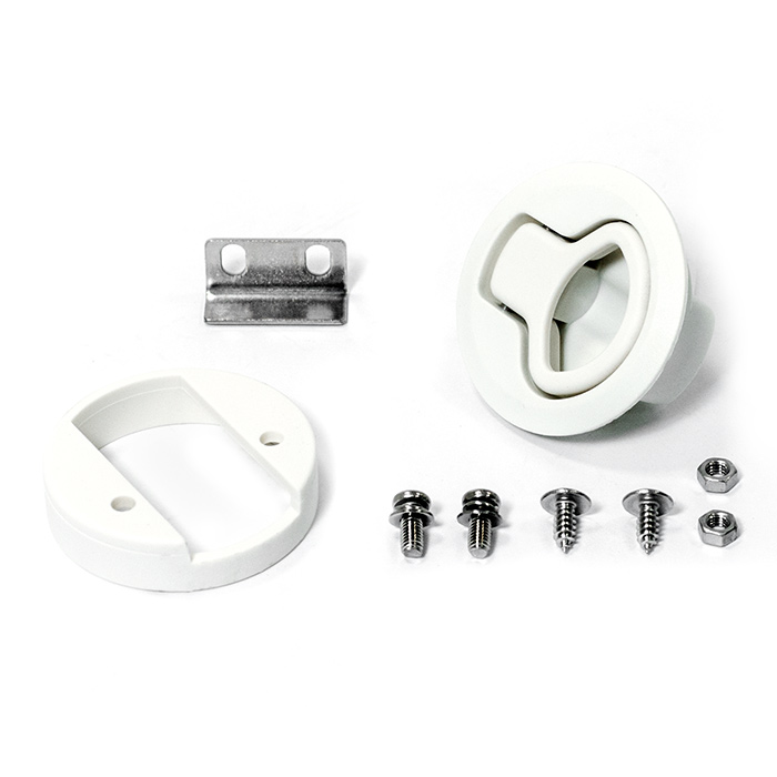 Потайной замок Sunfine изготовлен из белого пластика, имеет диаметр 61 мм и глубину 35 мм. Ответная планка с отверстием идет в комплекте с замком.