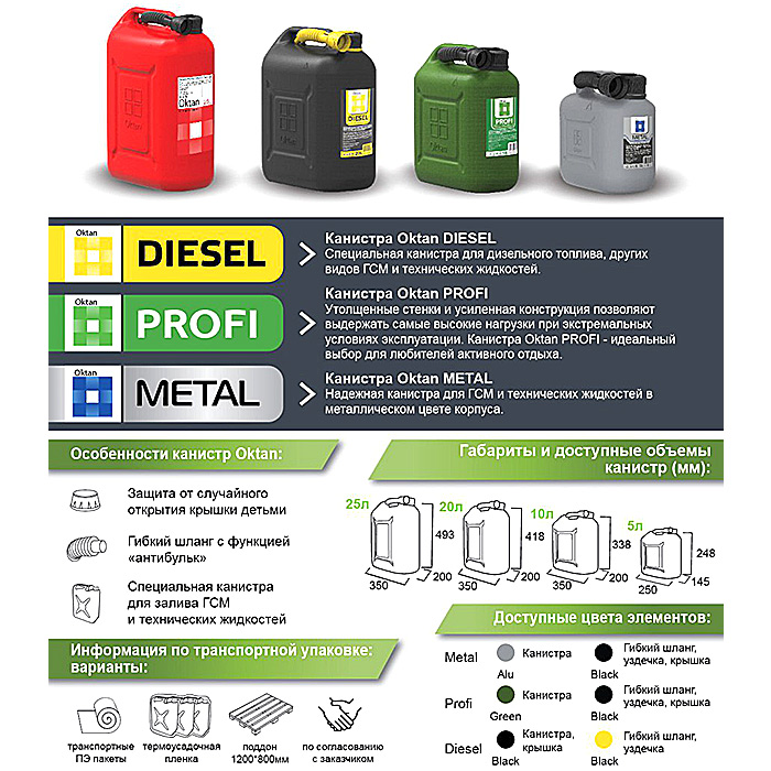 Все канистры снабжены крышкой с замком, предотвращающим случайное открытие и гибким заправочным носиком для удобной заливки топлива горловину бака транспортного средства.